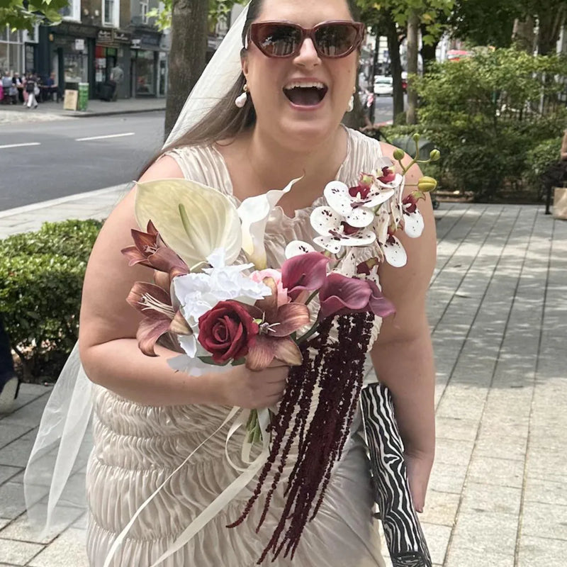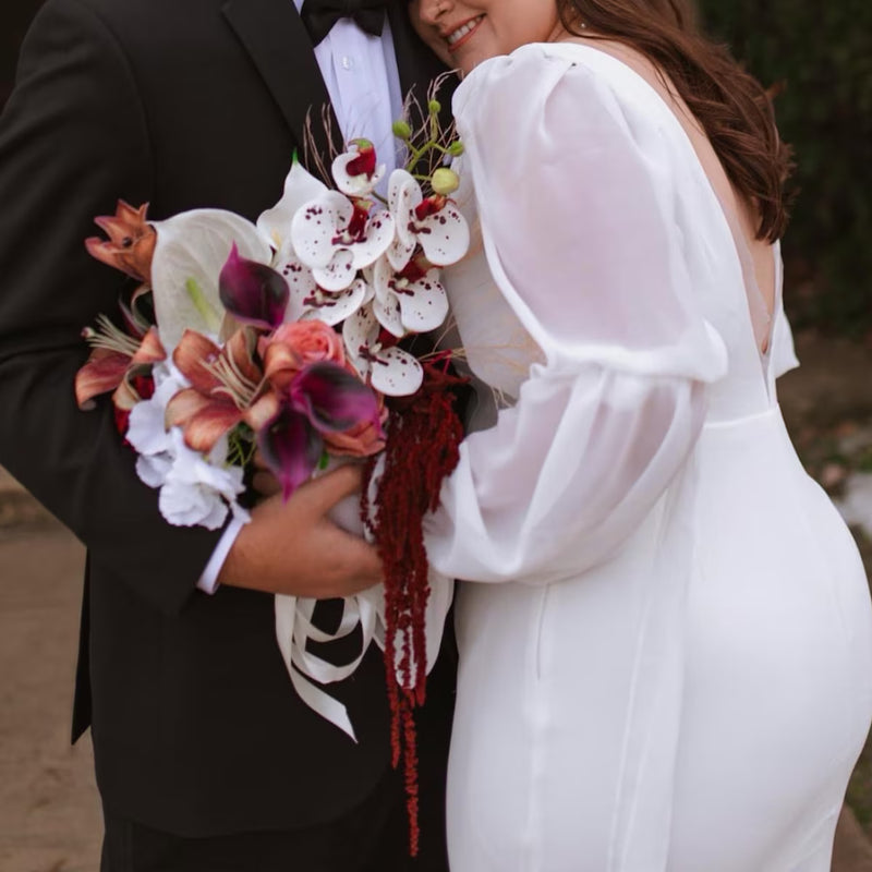 The Standard size is the bouquet as pictured. The Petite size features the same selection of flowers, not including the dried hanging amaranthus and cream anthurium, creating a more refined, compact silhouette.